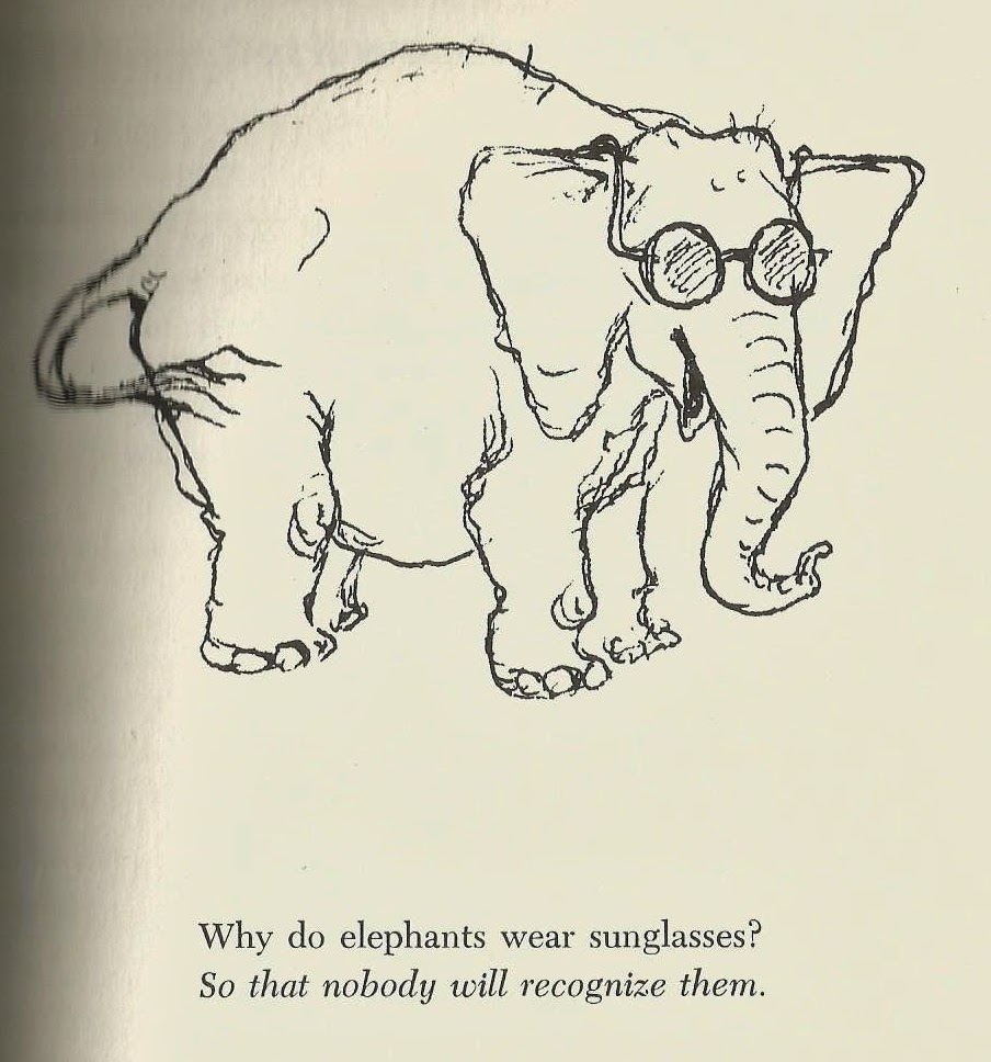 Further digging into the Old Chestnut barrel, this chapter also contains knock knock jokes along the lines of the one I presented earlier, albeit less profane, and that other eternal comedy staple: elephant jokes. According to the notes in the back of the book, elephant jokes were, ahem, HUGE in the 1960s. And why not, with gems like these?