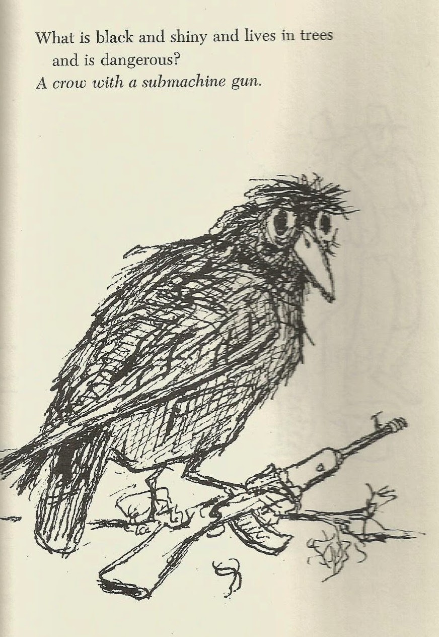 The second chapter consists of your archetypal joke: a question followed by a smart-ass answer. For example, you may ask, "What is a bulldozer?" only to get the response, "Why, that's a sleeping bull." It's doesn't get much more old school than that, by which I mean these jokes were already old back when I told them in elementary school. There's a good variety here, many of which would never work these days with the changes in dialect (Ex. "What did one toe say to the other?" "Don't look know, but there's a heel following us." This is pretty awkward unless you happen to be talking about pro wrestling). A few are startlingly profound, such as when the definition of ignorance is phrased as "when you don't know something and somebody finds out." Finally, we have the sinister Al-Quaida Crow: