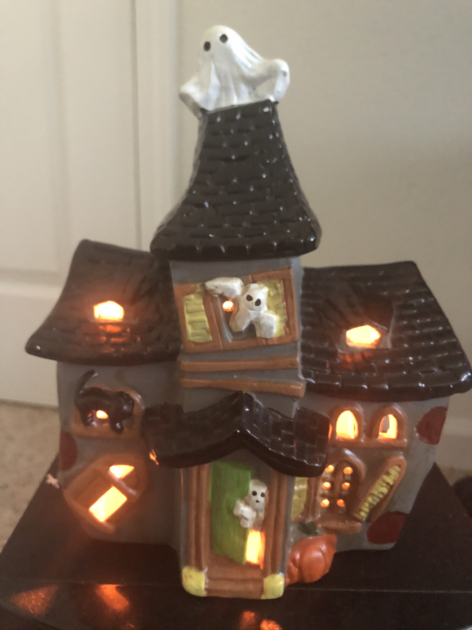 I cannot believe that his haunted house still lights up. I know we used to display it as the mobile home, which dates it at probably 30 years old or so, and I don't think the bulb has ever been changed, Yeah, sure, it's a dull, eerie shade of smog twilight orange at this point, but doesn't that add to the charm?