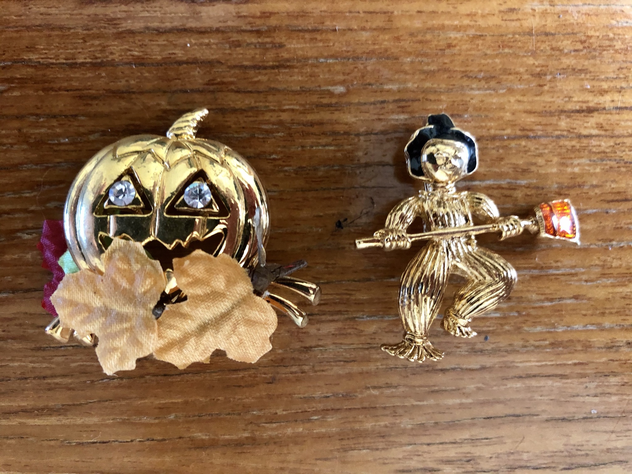 Yep, these are mine, though I have no idea what I was attaching them to back then. I love the jaunty little scarecrow that's on his way to curling practice, but I have to admit that I favor the jack-o'-lantern, what with his rhinestone eyes and faux fall foliage.