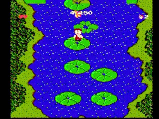 As you've probably guessed, this is unfortunately not the case, because of one more quirk of the game design: the screen is always scrolling forward, pushing you ahead. That's right, so not only are you expected to make precise jumps despite the difficulty of gauging a landing point and slippery controls, but you're also mindlessly marching forward the entire time while trying to make them. So when the game throws an entire lake full of giant lily pads in front of you to traverse, you've got to bounce across them and do so post haste. And, since of course this is all not torturous enough, these countless lily pads you're supposed to be jumping on?