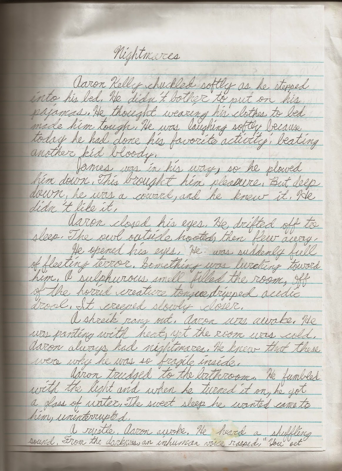 This was clearly some next level calligraphy-type sh*t that today's publishers don't know nothin' about. But, just in case you don't wish to decipher my beautiful runes, I have laboriously re-typed the entire story for your reading "pleasure." Presenting, for the first time on the World Wide Web, "Nightmares," from Nightmares and Other Tales.