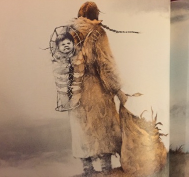 Up next we have this portrait of an interaction between the Pilgrims and Native Americans. Here it becomes apparent that even in a non-horror context, Gammell's artwork retains its ethereal and otherworldly qualities. Which is to say, it looks really damn cool. The guy in the middle kind of reminds me of the head from the cover of the first Scary Stories, though. In the poem itself, the Pilgrims thank God for only killing off half of them, which is maybe the ultimate example of a glass-half-full way of looking at things.