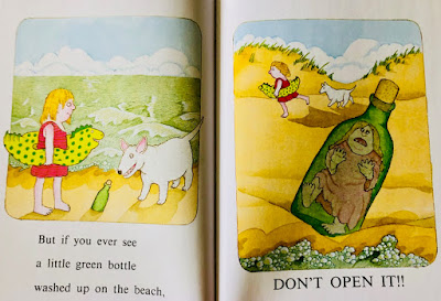 Joe is understandably quite vexed by this turn of events, but gets an idea. Playing on Kate's ego, he inquires as to whether her ghost powers would allow her to shrink down small enough to fit in the green glass bottle on the table, which I'm guessing is one of Joe's dad's empty Heinekens. Kate, lacking both vision and sense, boastfully desizes and hops in the bottle, which Joe promptly corks and hurls into the river. The story ends with a warning to the reader:
