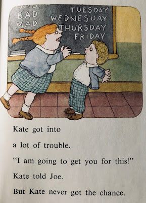 OK, I really need to talk about this one. It concerns two elementary school-age kids, Joe and Kate. Joe is a little twerp and Kate is a big bully, so she spends her time menacing him into compliance with her every whim, up to and including stealing his new bike. When she gets in trouble for this, she doubles down and vows to be even more awful to Joe. And then she just dies, which...I'm not going to say she deserved it, per se, being a kid and all, but I'm not exactly moved to tears by it either. In a way, it's a nice lesson for young readers: don't be an ass, because you could just keel over at any time.