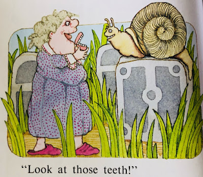Another entry in the "person does something incredibly disgusting and pisses off a ghost" genre of folklore along the lines of Scary Stories' "The Big Toe" and "Cemetery Soup," the story involves a woman who is pocket-sized, for some reason that does not affect the plot at all. One day, she happens to be walking through a similarly micro graveyard and happens upon a set of dentures on top of a grave. Inexplicably, she pops them in her mouth without even rinsing them off and goes on her merry way. Later, she takes a nap, grinning away with her tombstone teeth, only to be awakened by someone outside yelling at her to return the teeth. After some back-and-forth, she throws the teeth out the window, and her unseen harasser skitters back to the graveyard with them. Overall, a pretty classic story, albeit one somewhat hamstrung by its constant, annoying usage of the phrase "teeny-tiny" to describe everything. Yes, yes, this teeny-tiny woman lives in her teeny-tiny house in her teeny-tiny neighborhood and eats a teeny-tiny lunch at a teeny-tiny bistro and drinks a teeny-tiny negroni and PLEASE JUST STOP.