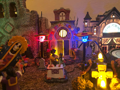 Of course, the real action goes down at night. Here we get an introduction to the concept behind this year's village via sign-based exposition.That's right, we're going with a Dia de los Muertos theme this year! Most of these pieces are from Dept. 56, who debuted this line a couple years ago and has regularly added to it ever since. They have formed the core of the layout here, though I've added other bits and pieces throughout, including some stuff from the very first village I ever did.