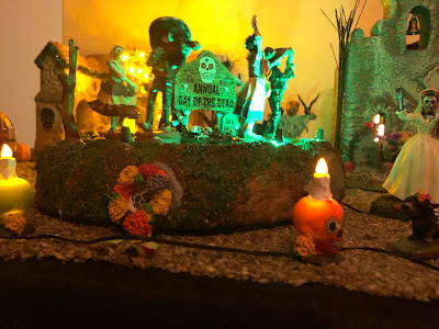 I've written in the past about my Halloween village display, an October decorative tradition stretching back so long that I vividly remember listening to Candlebox while setting it up at one point. In recent years, however, I've been facing a bit of a dilemma. Having expanded far beyond its humble Oriental Trading Co. origins, the current scope of the village in terms of sheer volume of options is quite vast, and as a result, I've had to make some difficult decisions. At first, I considered doing a significant expansion of the display, either in the form of one super-huge village or two entirely separate displays. In the end, space and time concerns (plus an injured back) led me to another approach: a single, highly focused village with a cohesive theme. Although this sadly led to the exclusion of many of the older pieces the very concept if this village was based around, I think I was able to put together one of my best displays yet! I'll let you be the judge.